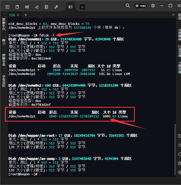 Disk /dev/nvme0n2:600 GiB,644245094400 字节,1258291200 个扇区
